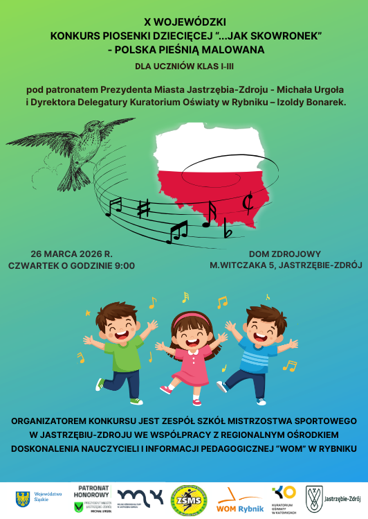 12 marca 2026 r. w Zespole Szkół Mistrzostwa Sportowego, Szkole Podstawowej nr 3 z Oddziałami Mistrzostwa Sportowego w Jastrzębiu-Zdroju odbył się Powiatowy Konkurs Piosenki Dziecięcej pod przewodnim hasłem – Polska pieśnią malowana. W konkursie wzięło udział 16 uczestników z klas I-III ze szkół podstawowych z miasta Jastrzębia-Zdroju, którzy zaprezentowali wybrane utwory z repertuaru polskiej piosenki dziecięcej. Wykonawcy z dużym zaangażowaniem i radością zaprezentowali przygotowane pieśni. Występy młodych artystów spotkały się z życzliwym przyjęciem publiczności i stworzyły wyjątkową, pełną muzyki i pozytywnych emocji atmosferę. Występy uczestników oceniało jury w składzie: dr Emilia Kopiec – muzyk, logopeda, manager kultury, dyrygent chóru. Juror wielu konkursów wokalnych dla dzieci i młodzieży, dr Urszula Słyk – nauczyciel muzyki w ZSMS, doradca metodyczny nauczycieli edukacji wczesnoszkolnej – RODN i IP „WOM” w Rybniku, Dagmara Wieczorek-Żogała – nauczyciel muzyki, instruktor wokalu i gry na pianinie. Współpracowała i występowała z czołowymi artystami polskiej muzyki rozrywkowej i klasycznej.